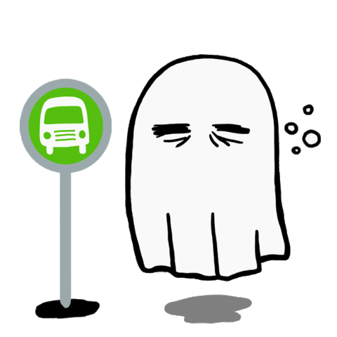 A tired, ghost-like figure with closed eyes dozes off while waiting at a bus stop, with a small puddle forming below.
