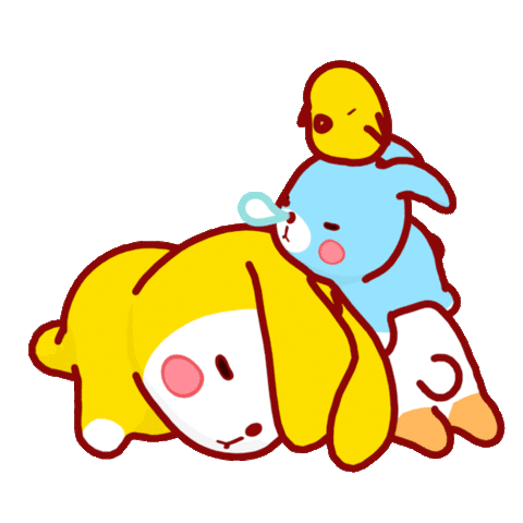 A cute yellow dog with a snot bubble dozes off while a blue bird rests on its back, surrounded by sparkling lights.
