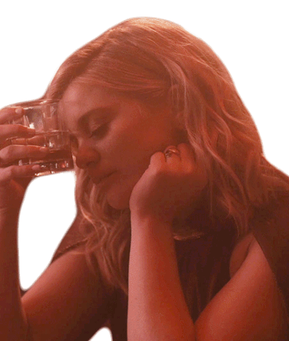 Lauren Alaina appears sleepy and inebriated, holding a glass of alcohol to her head, with a ring visible on her finger.