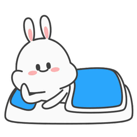 An adorable white cartoon rabbit with pink ears and rosy cheeks is lying down, looking relaxed and ready for a nap or sleep.