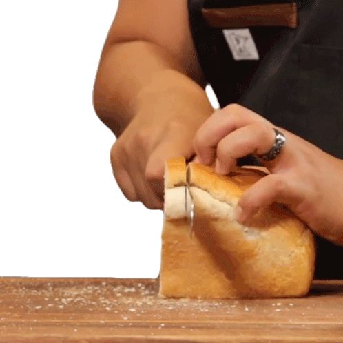 Joshua Walbolt expertly slices a fresh loaf of bread on a wooden cutting board, preparing food with precision.