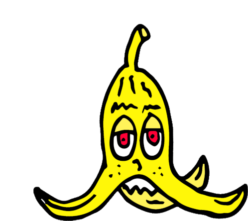 A cartoon banana peel with a grumpy, tired face and red eyes, looking like it's about to cause a slip.