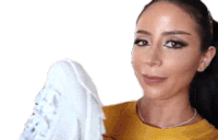 Woman in a yellow shirt holds a white sneaker to her mouth and licks it with her tongue, showing a playful gesture.