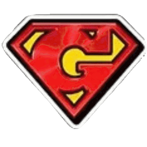 a red and yellow superman logo with a question mark in the middle .