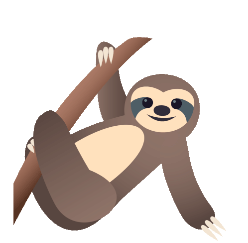 A cute Joypixels-style cartoon sloth is seen hanging upside down from a tree branch, smiling contentedly.