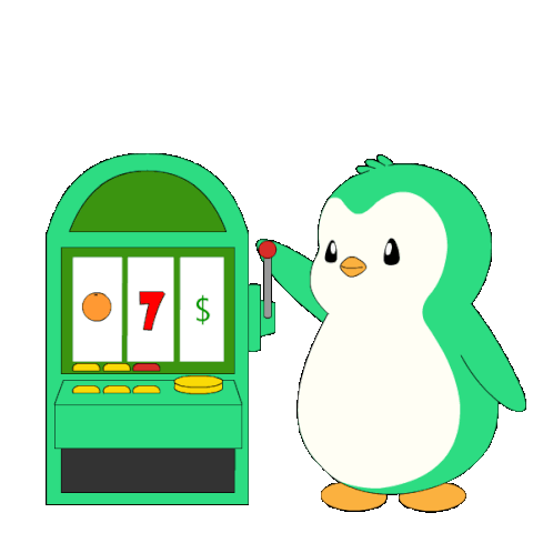 A cute green penguin character, Abster, plays a slot machine and hits the jackpot with three sevens.