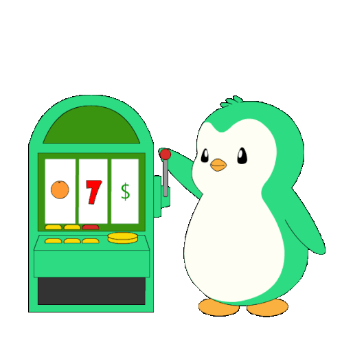 Abster, a cute cartoon penguin, plays a green slot machine, pulling the lever and watching the reels spin.