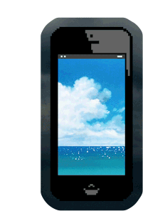 A pixel art smartphone displays a sunny ocean scene while its background shows a stormy sky with lightning.