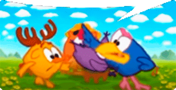 a cartoon of a moose and two birds with a speech bubble in the middle