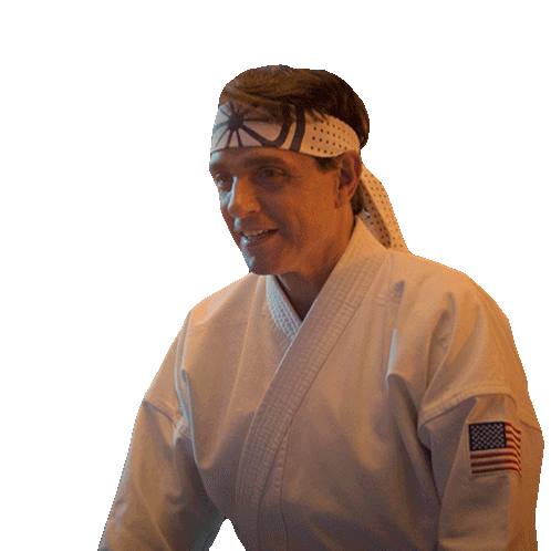 Daniel LaRusso, wearing his karate gi with an American flag, smiles and then looks thoughtful.