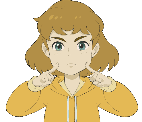 Kat, a cheerful cartoon girl in a yellow hoodie, smiles brightly, pushing up her cheeks to wish you a great day.