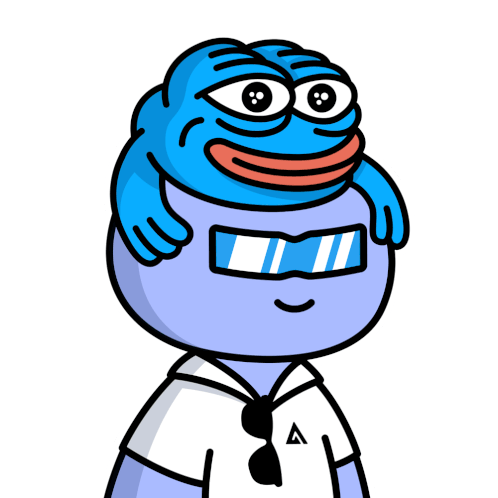 A friendly Arbinaut character wearing sunglasses and a white shirt, with a blue Pepe the Frog on its head, smiling and greeting.