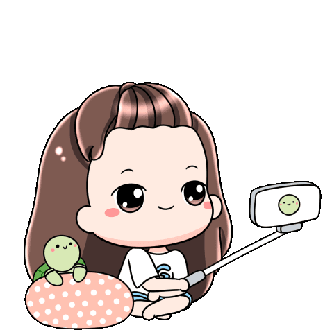 A cute cartoon girl with a turtle friend takes a happy selfie with a selfie stick, smiling brightly.