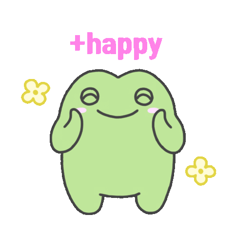 A cute, light green, blob-like character with rosy cheeks smiles happily, accompanied by "+happy" text and yellow flowers.