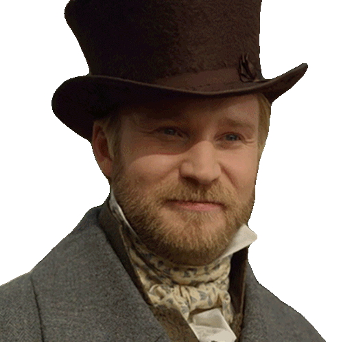 Lord Alfred Debling, portrayed by Sam Phillips, smiles warmly while wearing a distinguished top hat and cravat.