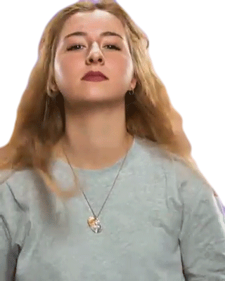 A blonde woman with long hair smiles and then gives a direct stare, perfect for greeting with 'Hey There' or 'Whats Up'.