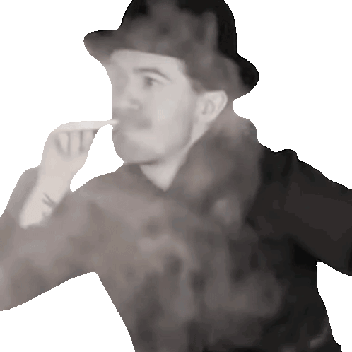 Bradley Hall, wearing a hat, smokes and exhales a cloud of smoke, creating a cool, vintage effect.