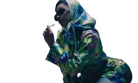 Cardi B smoking a cigar, wearing sunglasses and a headscarf, with a confident and stylish pose.