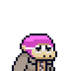 A pixel art character from Smolverse with pink hair and glasses blinks, showing a pensive expression.