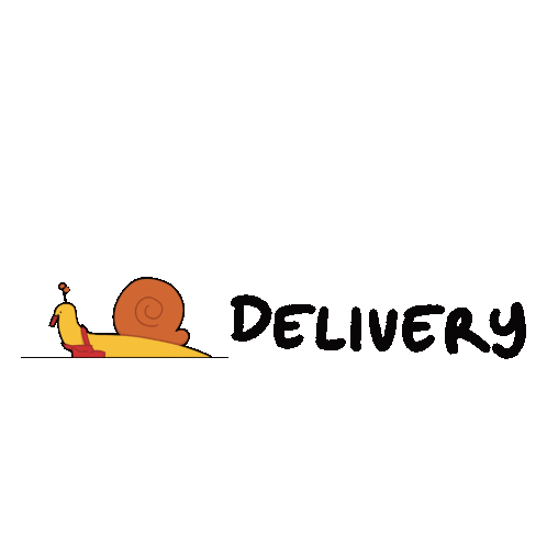 An animated cartoon snail, wearing a red bandana and carrying a small red bag, slowly moves next to the word 'DELIVERY'.
