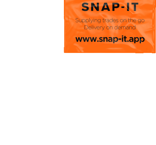 An orange Snap-It app delivery bag, promoting 'Supplying trades on the go' and 'Delivery on demand' services.