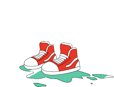 Animated red sneakers jump and splash into green puddles, reminiscent of a rainy Fuji Rock festival atmosphere.