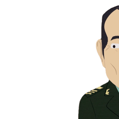 A South Park general in military uniform peeks from the side, looking around with a suspicious expression.