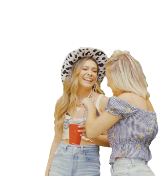 Maddie and Tae share a laugh as one discreetly pours a drink into a red cup, embodying the 'sneaky shots' vibe.