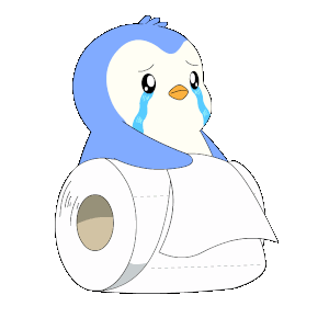 A cute penguin character is crying with tears and using a roll of toilet paper, appearing sick or having allergies.