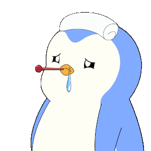 Pudgy Penguin feeling unwell, with a thermometer in its beak and a runny nose, looking sad and sick.