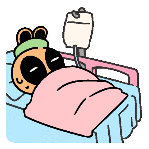 A cute cartoon character is sick in a hospital bed, receiving an IV drip. Shows a feeling of being unwell and needing rest.
