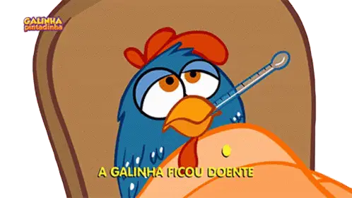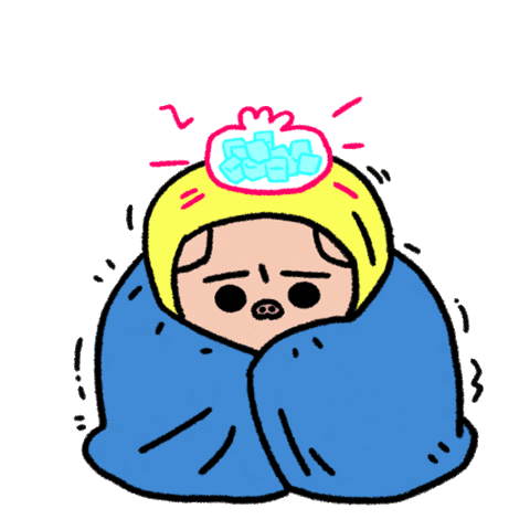 A cartoon character shivering under a blanket with an ice pack on its head, indicating high fever and illness.