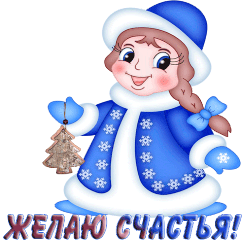 a cartoon of a girl in a blue coat holding a christmas tree with the words " желаю счастья " below her