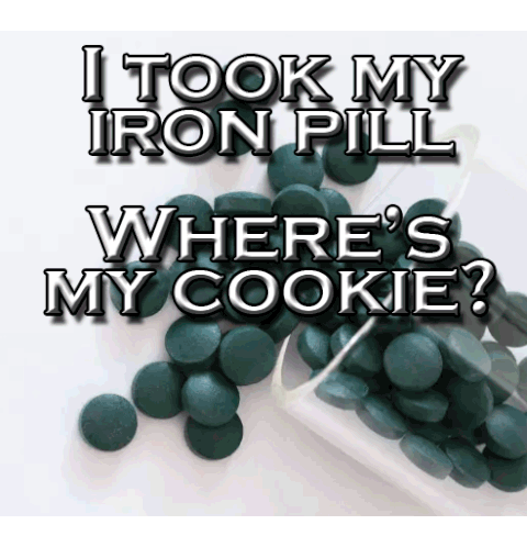 Sngsupergirl meme featuring the text 'I took my iron pill, where's my cookie?' with pills and a chocolate chip cookie.