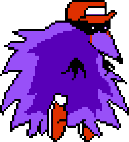 Snickexe from Pizza Tower, a pixel art character, is depicted as a purple monster with a red hat and cape.