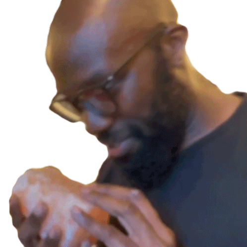Rich Rebuilds, a man with glasses, intently sniffs a small object held in his hands, showing curiosity.