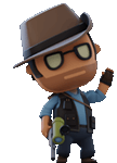 Chibi-style Sniper character waving hello, wearing a hat and glasses.