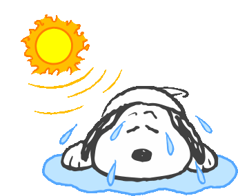 Snoopy is shown lying down, looking exhausted and sweating profusely under the intense heat of the sun.
