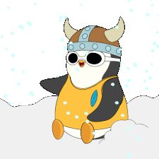 A cute penguin in a viking helmet and goggles gets comically hit in the head by a snowball, covering its face.