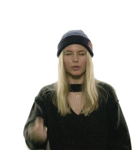 A woman wearing a Red Bull beanie celebrates with an enthusiastic fist pump, expressing joy and success.