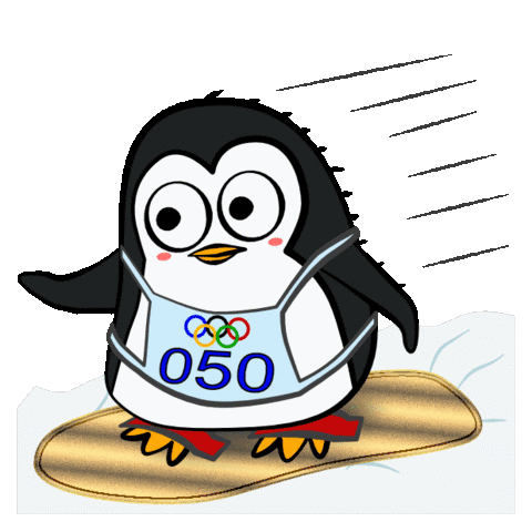 A determined cartoon penguin, wearing an Olympic bib with '050', snowboards down a slope with speed lines.
