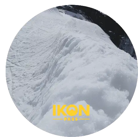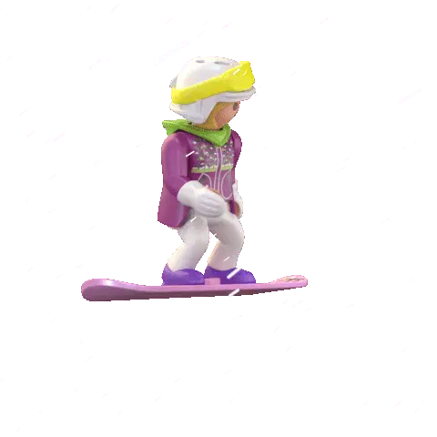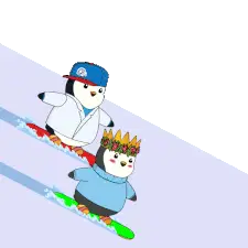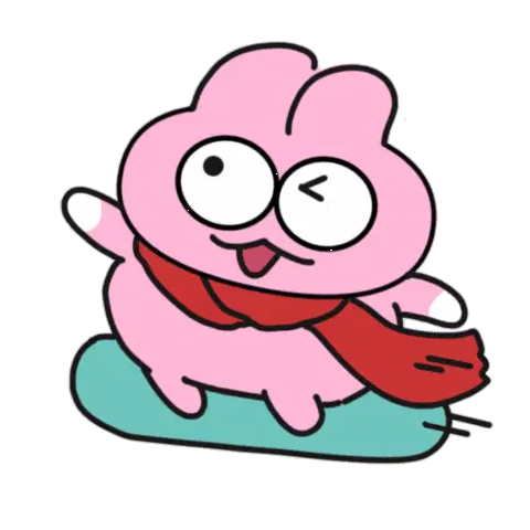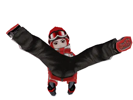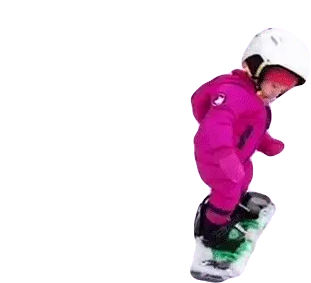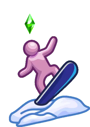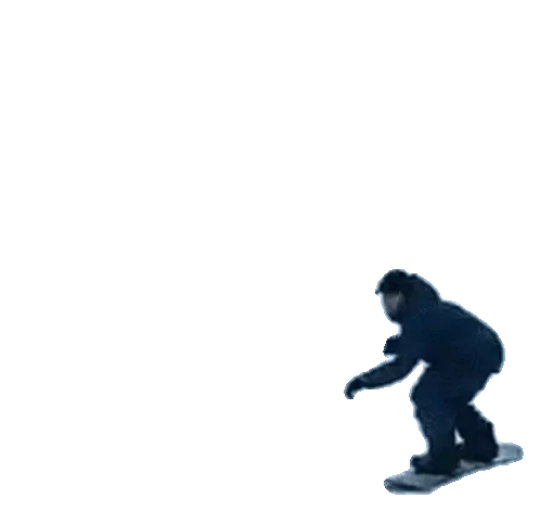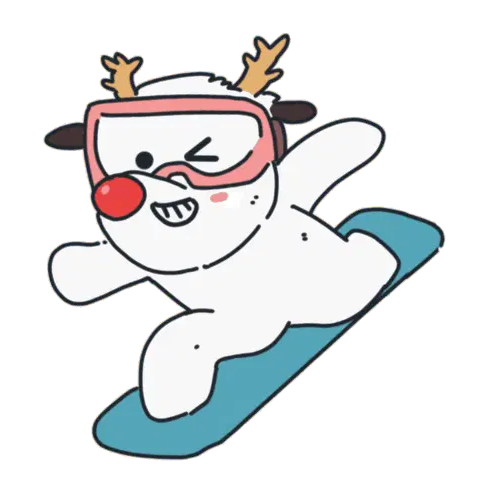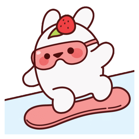 A cute cartoon character, possibly a rabbit, peeks from the side while snowboarding down a slope.