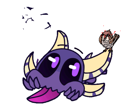 A purple cartoon creature with horns reacts to a small bird making loud, tormenting noises on its tentacle.