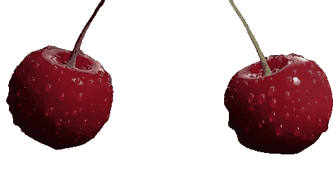 Two vibrant red cherries, glistening with water droplets, gently collide as water splashes around them in a refreshing animation.