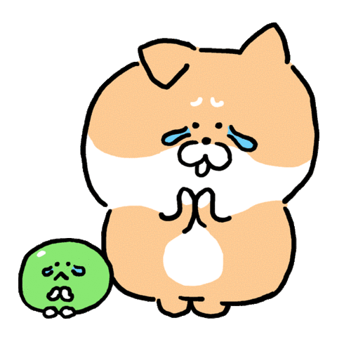 A cute cartoon dog with a sad, crying face and a small green friend make an apologetic gesture with clasped paws.