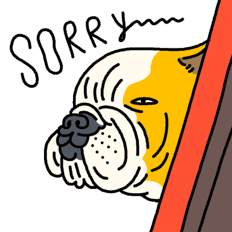 An apologetic bulldog peeks from behind a curtain with "SORRY" written above, expressing regret and asking for excuse.