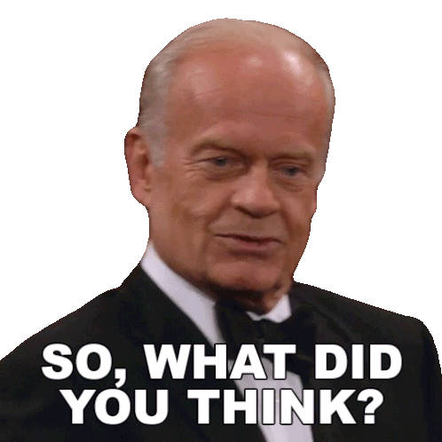 Dr. Frasier Crane, in a tuxedo, asks 'So, what did you think?' inviting feedback or opinions.