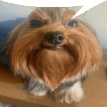 a close up of a dog with a speech bubble above it