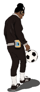 Bob Marley, the reggae legend, stands with one foot on a soccer ball, wearing a tracksuit and headphones, ready to play.