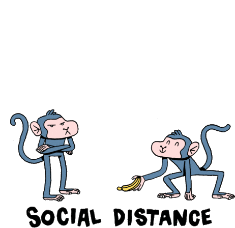Two cartoon monkeys illustrate social distancing, with one holding a banana and the other reaching out, emphasizing the need for space.